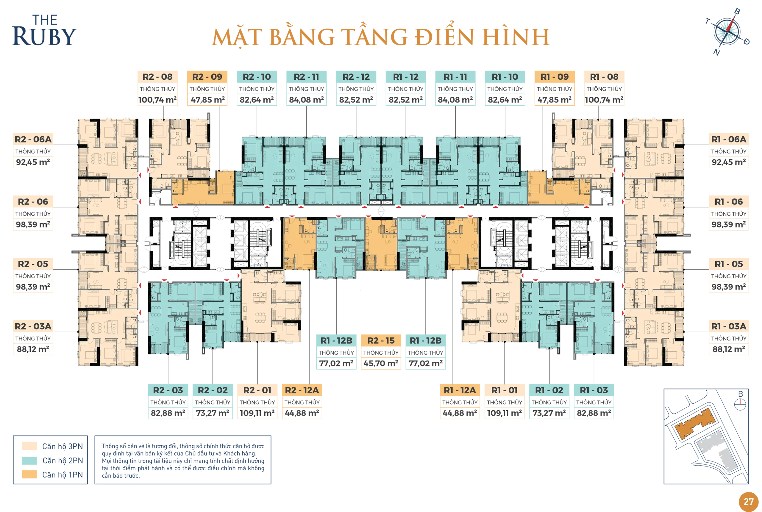 – Loại hình: Căn hộ 1, 2, 3 phòng ngủ, diện tích từ 34m² đến 129m²
