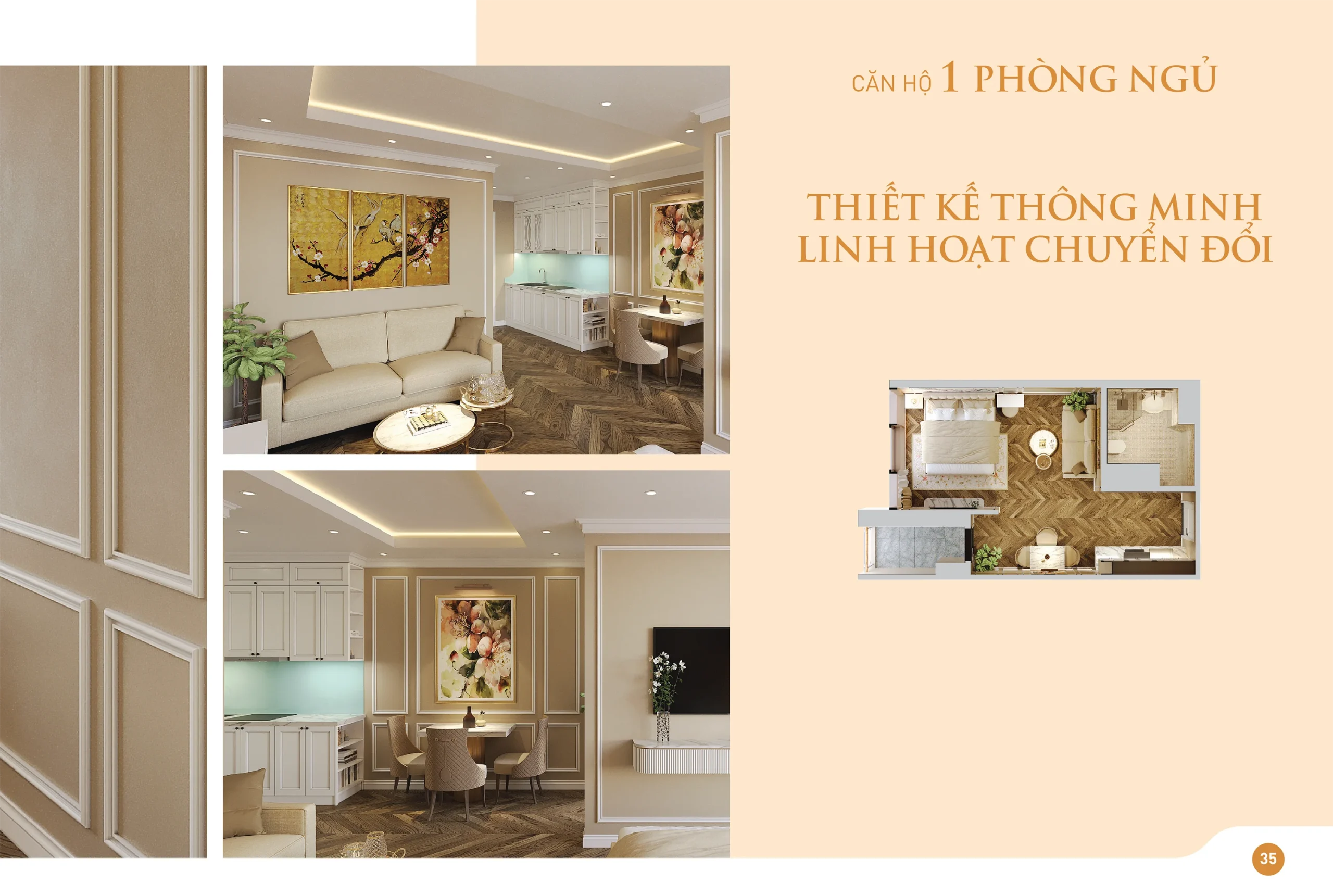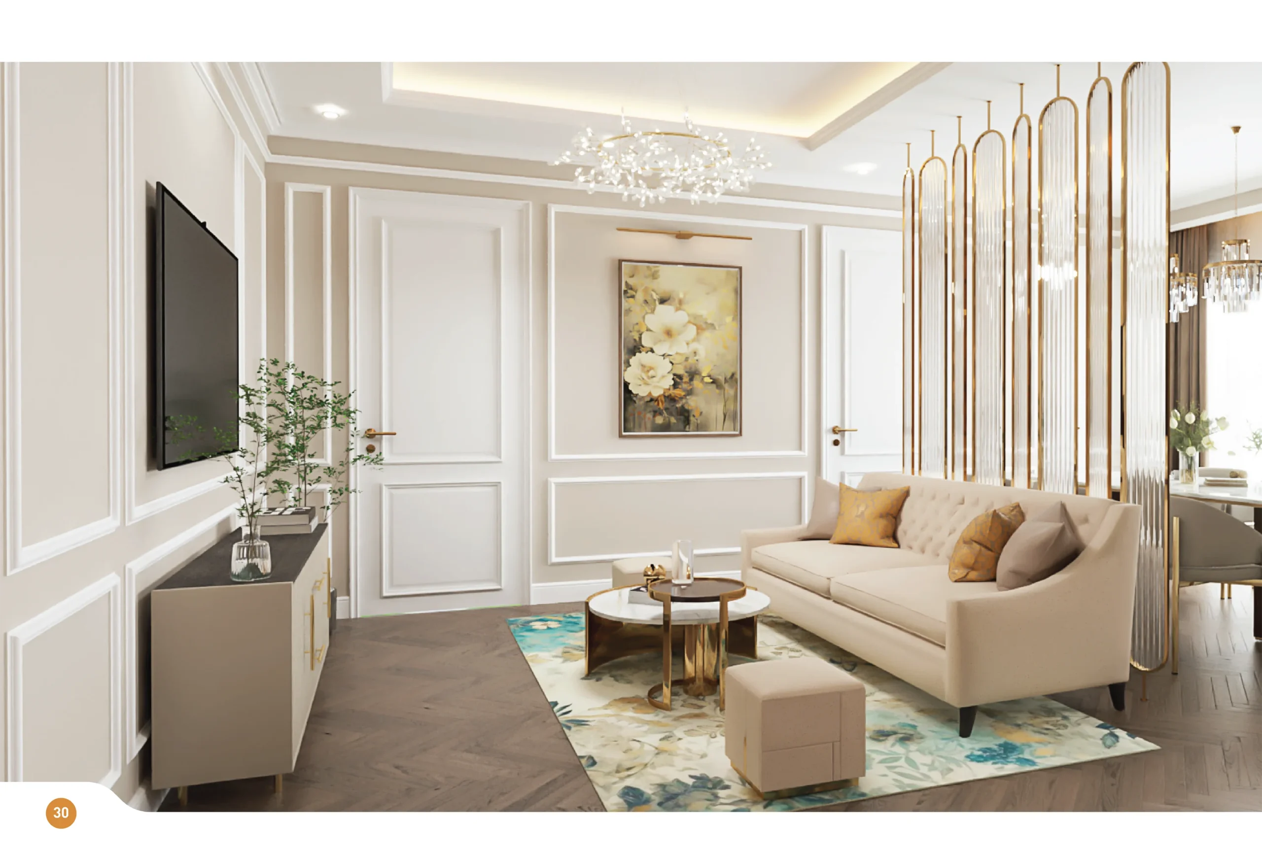 Không gian sống: Trần thạch cao, tường sơn cao cấp, sàn gỗ/gạch sang trọng.