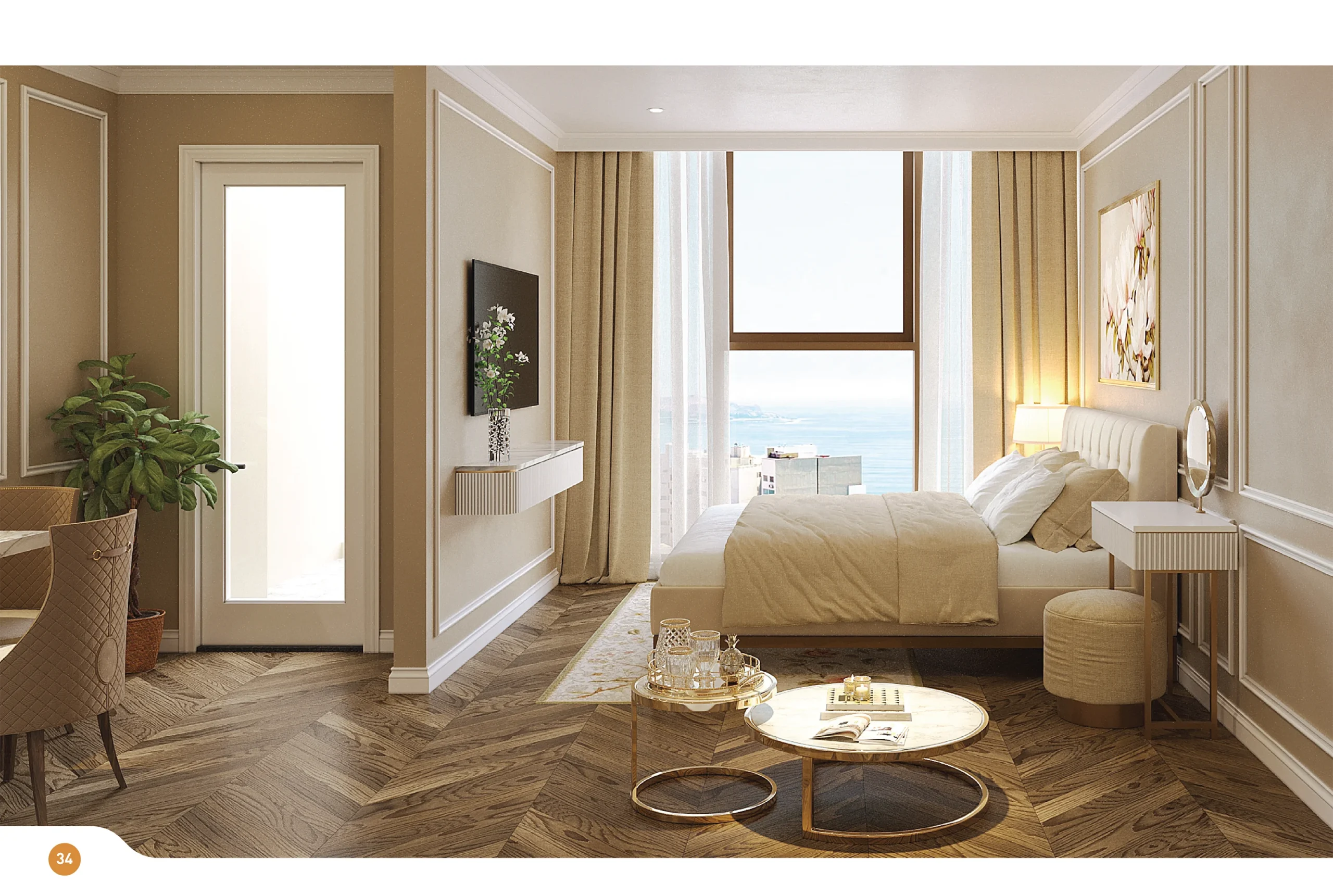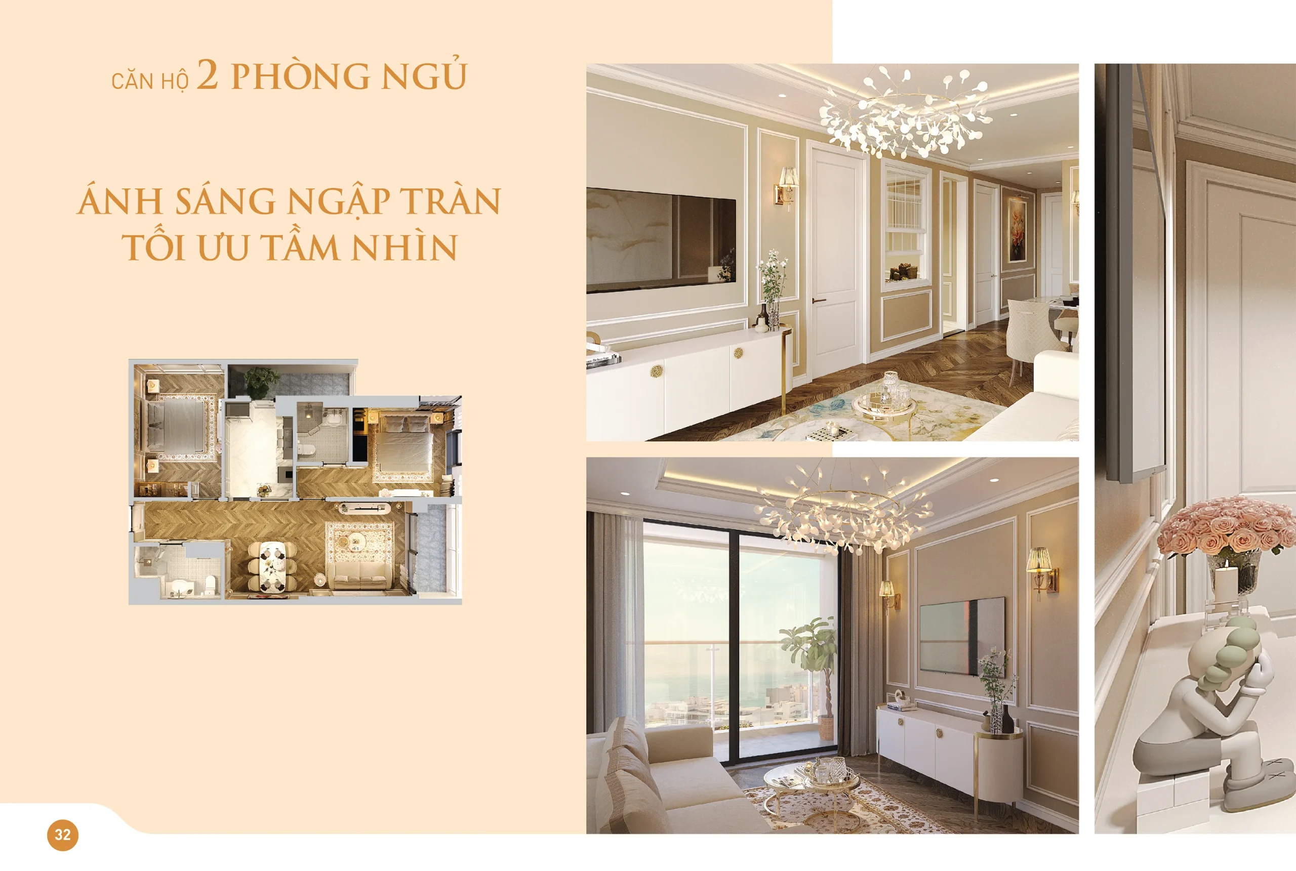 Sử dụng ngôn ngữ kiến trúc hiện đại với mặt kính toàn phần và trần cao 3.6m, mọi căn hộ đều được tối ưu ánh sáng tự nhiên và tầm nhìn panorama. Ban công rộng rãi trở thành không gian thư giãn lý tưởng để đón bình minh trên biển hay ngắm hoàng hôn trên sân golf.