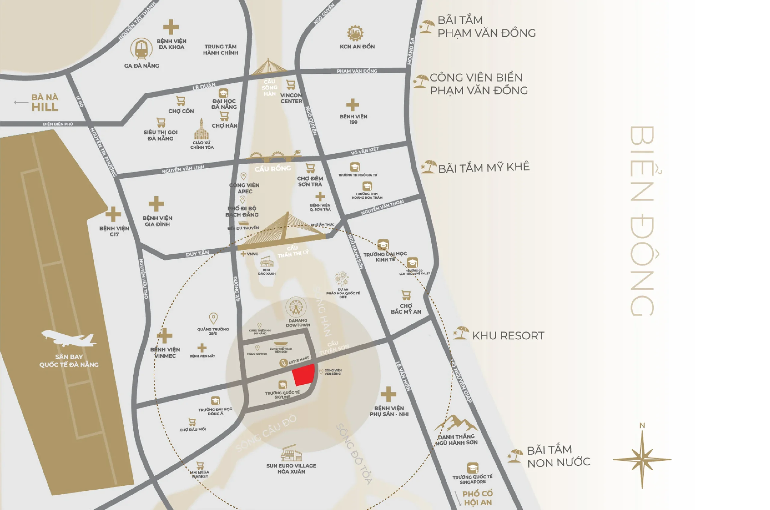 Trung tâm mới của khu vực Tuyến Sơn – Hải Châu, nằm trên tuyến huyết mạch gần cầu Tuý Sơn, dẫn lối đến các di sản thế giới và các trung tâm tài chính, thương mại đang hình thành – nơi giao thoa giữa giá trị văn hóa, quyền lực kinh tế và đầu tư tăng trưởng bền vững.